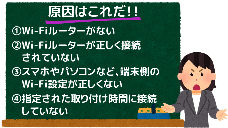 Wi-Fiが使えない原因は、ほとんどが次の4つです。